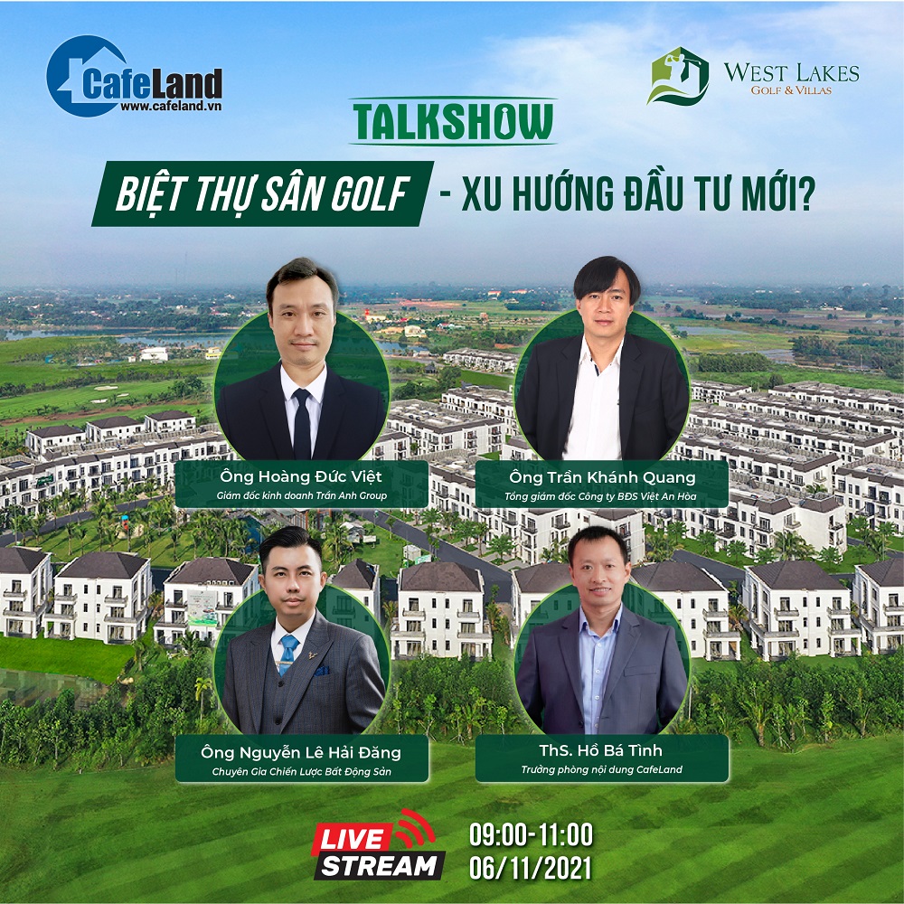 Tại buổi talkshow "Biệt thự sân golf - xu hướng đầu tư mới", CafeLand sẽ cùng các chuyên gia đánh giá về tiềm năng phát triển và cơ hội đầu tư biệt thự sân golf hiện nay. Đồng thời, các chuyên gia cũng sẽ đưa ra những chiến lược đầu tư hợp lý và rủi ro cần lưu ý khi đầu tư phân khúc này.