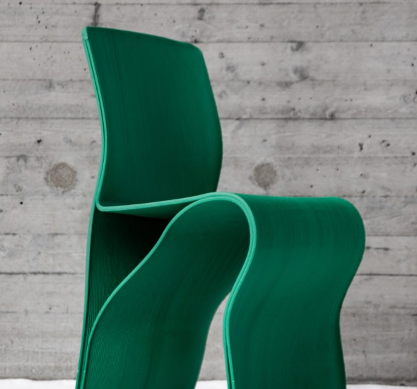 Lưới đánh cá được kết hợp với sợi gỗ tái chế được chứng nhận FSC để tạo ra vật liệu composite sinh học của đồ nội thất, đồng thời được in 3D để tạo ra hình dạng uốn lượn của chiếc ghế.