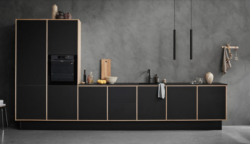 Nhà bếp được làm từ các bộ phận ván ép bạch dương có thể thay thế với mặt trước bằng vải sơn Forbo tùy chọn có sẵn với hơn 20 màu.