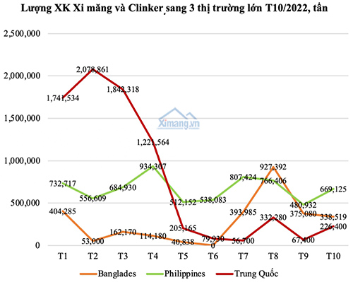 Tại thị trường xuất khẩu, sản lượng xi măng xuất khẩu của toàn ngành ước đạt 2,1 triệu tấn, tăng 28% so với tháng 9. Trong đó, xuất khẩu xi măng đạt 1,24 triệu tấn, clinker đạt 859.299 tấn. Giá trị xuất khẩu trong tháng 10 đạt 93,8 triệu USD, tăng 18% so với tháng 9 nhưng giảm tới 443% so với cùng kỳ năm 2021.