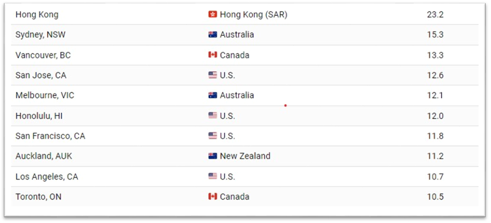 Bảng trên liệt kê 10 thành phố có giá nhà “làm khó người mua” nhất thế giới, dựa trên tỷ lệ giữa giá nhà và thu nhập trung bình của các hộ gia đình. Theo đó, những thành phố đạt tỷ lệ 5,1 trở lên được coi là vô cùng khó mua nhà, từ 4,1 đến 5,0 điểm được đánh giá là nghiêm trọng về khả năng chi trả, và 3,1 đến 4,0 là khó mua nhà ở mức vừa phải.