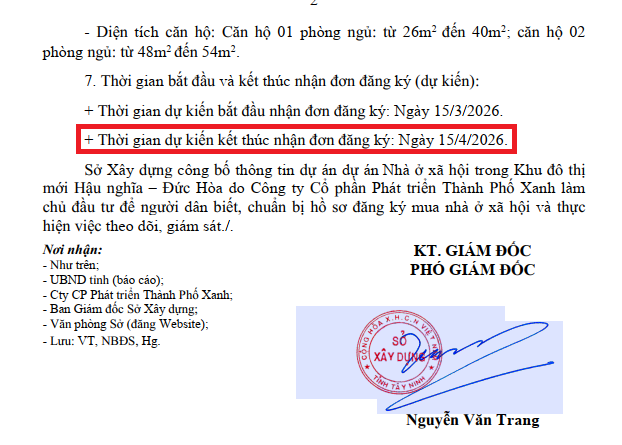 Hiện nay, Tây Ninh đang đẩy mạnh phát triển nhà ở xã hội. Năm 2026 tỉnh dự kiến cung cấp khoảng 2.776 căn từ 7 dự án đủ điều kiện. Dự án gần 1.500 căn này chiếm tỷ lệ lớn, góp phần thực hiện mục tiêu quốc gia về nhà ở xã hội. Ông Nguyễn Văn Trang – Phó Giám đốc Sở Xây dựng Tây Ninh – ký thông báo nêu rõ: “Công bố thông tin để người dân biết, chuẩn bị hồ sơ đăng ký mua nhà ở xã hội và thực hiện việc theo dõi, giám sát”.