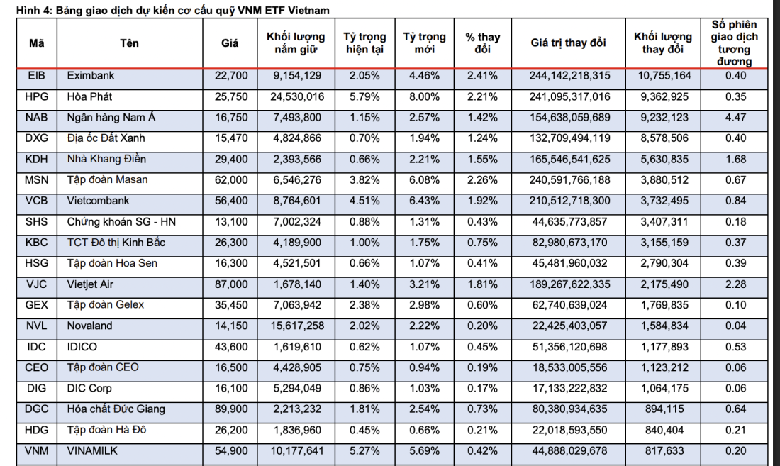 Quỹ VNM ETF sẽ giảm tỷ trọng cổ phiếu VIC, VHM. Đây sẽ là 2 mã dẫn đầu nhóm cổ phiếu bị bán ra, với việc bán ra 7,2 triệu cổ phiếu VIC, 5,1 triệu cổ phiếu VHM, VND và VCI cũng bị bán ra lần lượt, trong khi đó Quỹ sẽ mua ròng vào 10,7 triệu cổ phiếu EIB; 9,3 triệu cổ phiếu HPG và hơn 9 triệu cổ phiếu NAB...
