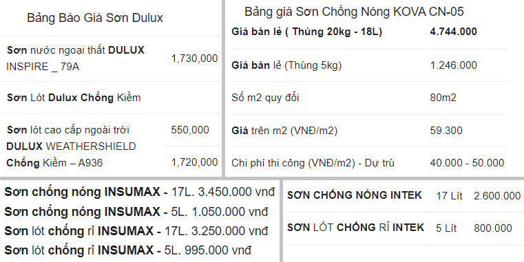Trên đây là bảng giá tham khảo một số thương hiệu sơn chống nóng hiện nay. Bảng giá sơn chống nóng chi tiết, cụ thể, bạn đọc vui lòng liên hệ đơn vị bán hàng.