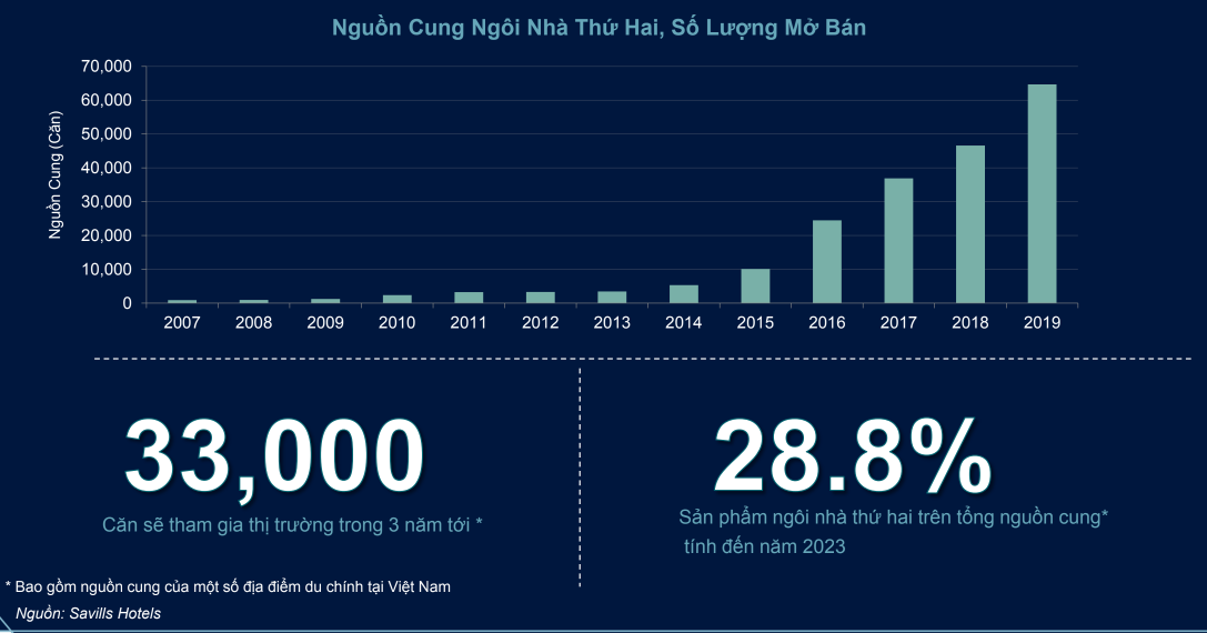 Savills Hotels vừa phát báo cáo về thị trường ngôi nhà thứ 2 (gồm các sản phẩm như biệt thự nghỉ dưỡng, condotel, branded residence) với nhận định nguồn cung ở phân khúc ngày đang ngày càng gia tăng. Theo thống kê của đơn vị này, trong vòng 3 năm tới sẽ có thêm 33.000 sản phẩm ngôi nhà thứ 2 thuộc phân khúc từ midscale (trung bình, hạng tiêu chuẩn) được đưa vào hoạt động, nâng tỷ trọng sản phẩm ngôi nhà thứ hai lên tới 28,8% trên tổng nguồn cung lưu trú tại một số thị trường du lịch chính. Đây là tỷ lệ hiếm gặp tại các thị trường khác.