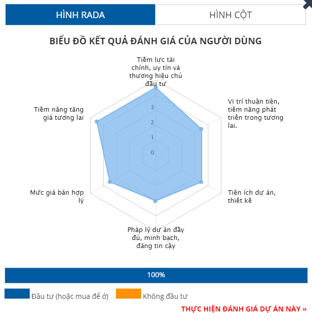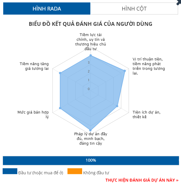 Dựa theo biểu đồ đánh giá người dùng ở trên có thể thấy dự án đang được bạn đọc đánh giá cao về tiêu chí vị trí thuận lợi với 5/5 điểm. Đứng thứ 2 với 4/5 điểm thuộc về tiêu chí: tiềm lực tài chính, uy tín và thương hiệu chủ đầu tư; tiềm năng tăng giá trong tương lai; mức giá bán hợp lý.