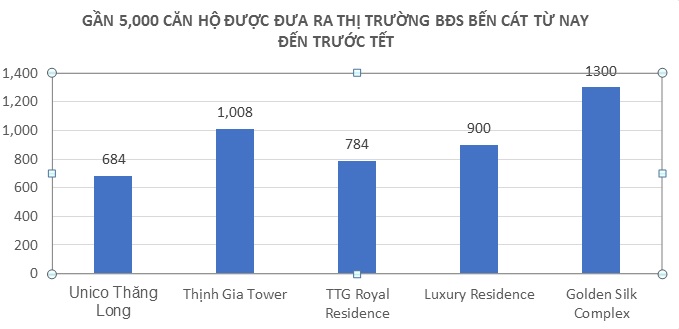 Theo khảo sát, chỉ riêng trong 4 tháng cuối năm, thị trường bất động sản thị xã Bến Cát sẽ đón nhận nguồn cung gần 5.000 căn hộ đến từ 6 đại dự án của các chủ đầu tư lớn như: Thịnh Gia Tower (hơn 1.000 căn hộ); Unico Thăng Long (gần 700 căn hộ), TTG Royal Residence (784 căn hộ), Phú Gia Luxury Residence (hơn 900 căn hộ); Golden Silk Complex (1.300 căn hộ).