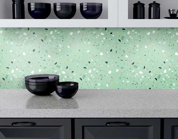 Gạch ốp tường bếp màu xanh với họa tiết vân đá tự nhiên, ấn tượng.