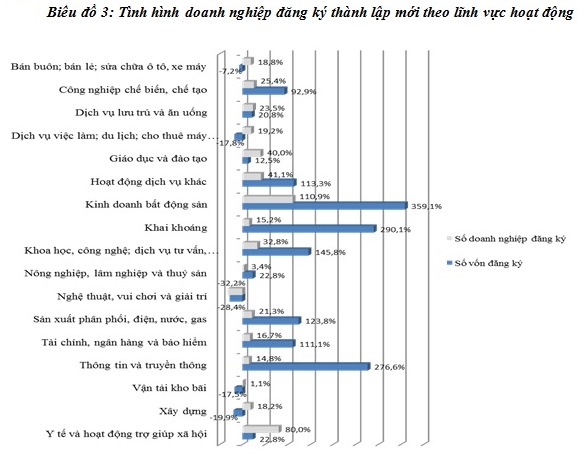 Theo đó, trong 6 tháng đầu năm 2016, hầu hết các ngành, lĩnh vực hoạt động có xu hướng tăng về tỷ lệ doanh nghiệp thành lập mới so với cùng kỳ năm 2015 như: Kinh doanh bất động sản đăng ký 1.354 doanh nghiệp, tăng 110,9%. Xếp sau là lĩnh vực Y tế và hoạt động trợ giúp xã hội đăng ký 243 doanh nghiệp, tăng 80%, hoạt động dịch vụ khác đăng ký 484 doanh nghiệp, tăng 41,1%...
