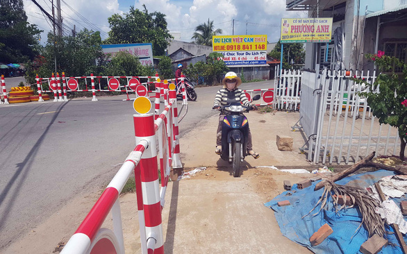 Một đoạn rào chắn ôm hết phần lòng đường quốc lộ 91, chỉ còn khoảng hẹp là lối đi an toàn cho người và xe qua đây - Ảnh: B.Đấu.