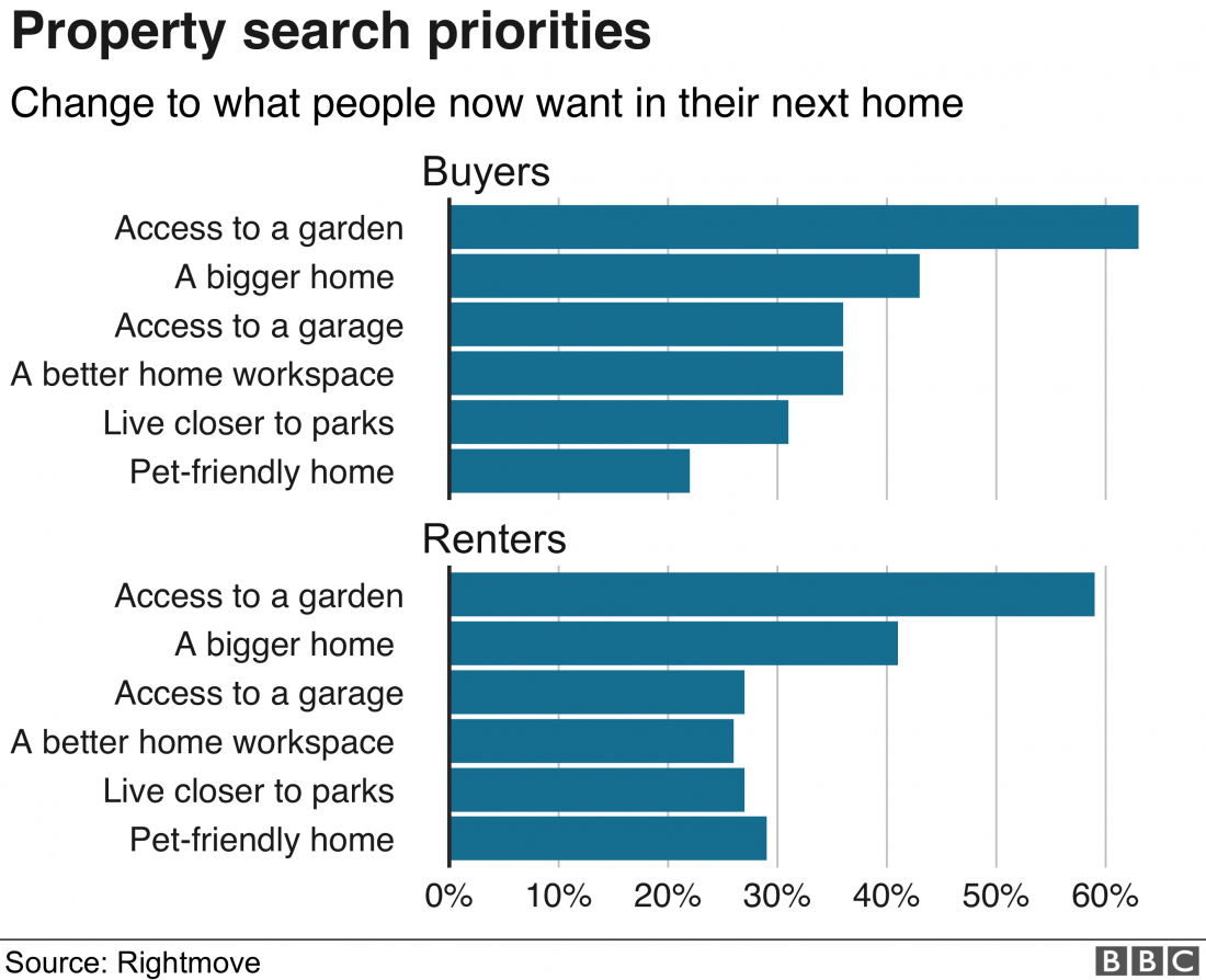 Rightmove, trong một nghiên cứu cho kênh truyền hình BBC, thông qua website và cuộc khảo sát 4.000 người tiềm năng cho biết có 39% người mua và 49% người thuê đã thay đổi những gì họ trông đợi khi cuộc sống bị tác động bởi đại dịch.