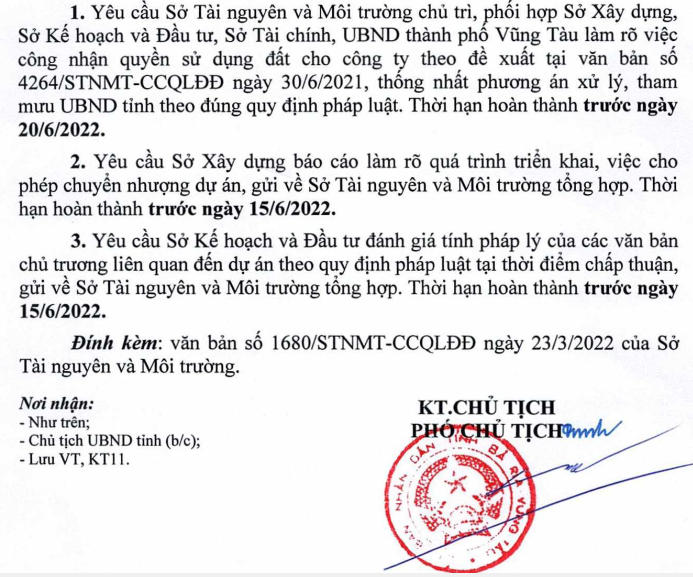Theo đó, UBND tỉnh yêu cầu Sở Tài nguyên và Môi trường chủ trì, phối hợp Sở Xây dựng, Sở Kế hoạch và Đầu tư, Sở Tài chính, UBND thành phố Vũng Tàu làm rõ việc công nhận quyền sử dụng đất cho Công ty theo đề xuất tại văn bản số 4264/STNMT-CCQLĐĐ ngày 30/6/2021. Thống nhất phương án xử lý, tham mưu UBND tỉnh theo đúng quy định pháp luật. Thời hạn hoàn thành trước ngày 20/6/2022.