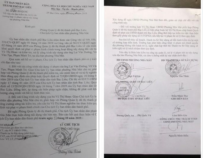 Văn bản chỉ đạo xử lý của chủ tịch TP Bạc Liêu và biên bản làm việc của Thanh tra Sở Xây dựng Bạc Liêu dường như không có tác dụng