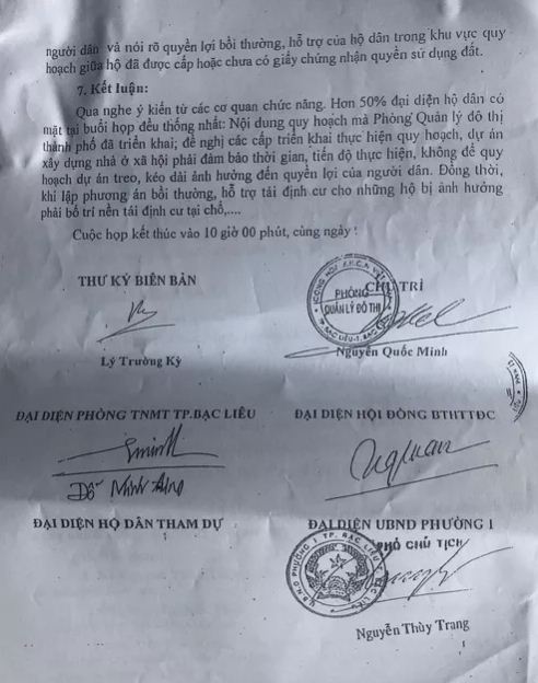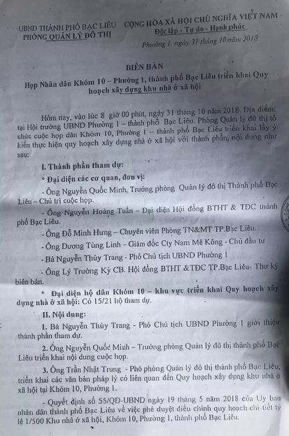 Biên bản nói trên được lập vào ngày 31-10-2018, do ông Nguyễn Quốc Minh, Trưởng Phòng Quản lý đô thị TP Bạc Liêu chủ trì với các cơ quan ban ngành TP Bạc Liêu. Nội dung là làm việc với đại diện các hộ dân ở khu vực triển khai dự án xây dựng nhà ở xã hội (khóm 10, phường 1, TP Bạc Liêu). Theo biên bản thì có 15/21 hộ dân tham dự. Trong đó, có lấy 3 ý kiến phát biểu đại diện của các hộ dân là bà Bùi Thị Nga, bà Nguyễn Cẩm Vân và ông Tô Hoàng Dũng. Các ý kiến này đều thống nhất cho chuyển đổi dự án thành dự án nhà ở xã hội.