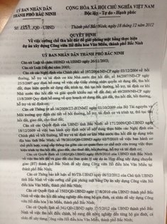 Trong khi đó ngày 18/12/2012, UBND thành phố Bắc Ninh vẫn ra quyết định số 1857/QĐ – UBND về việc cưỡng chế thu hồi đất để giải phóng mặt bằng thực hiện dự án đối với những hộ dân cố tình không nhận tiền bồi thường, hỗ trợ, làm ảnh hưởng đến tiến độ dự án.