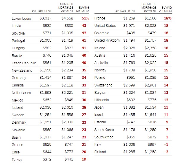 Trong số các quốc gia được khảo sát, Luxembourg dù có diện tích nhỏ bé nhưng lại có mức phí vay thế chấp cao nhất. Người mua nhà tại đây sẽ phải trả khoảng 4.558 USD mỗi tháng, cao hơn khoảng 50% so với giá thuê trung bình là 3.017 USD. Xếp thứ hai là Latvia, nơi khoản thanh toán thế chấp 830 USD cao hơn 42% so với giá thuê trung bình là 582 USD. Ý và Phần Lan là hai quốc gia duy nhất mà việc mua nhà được coi là rẻ hơn thuê nhà, mặc dù mức chênh lệch không nhiều.