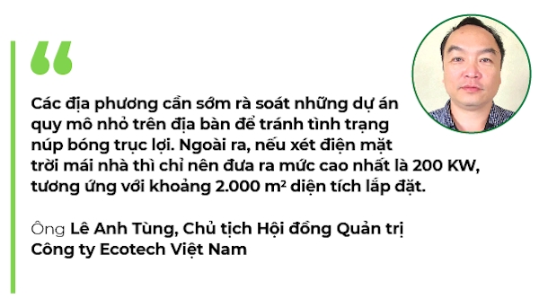“Các địa phương cần sớm rà soát những dự án quy mô nhỏ trên địa bàn để tránh tình trạng núp bóng trục lợi. Ngoài ra, nếu xét điện mặt trời mái nhà thì chỉ nên đưa ra mức cao nhất là 200 KW, tương ứng với khoảng 2.000 m2 diện tích lắp đặt. Thực tế, không nhiều hộ gia đình, tòa nhà công sở có diện tích lớn hơn mức này”, ông Lê Anh Tùng, Chủ tịch Hội đồng Quản trị Công ty Ecotech Việt Nam, chia sẻ.Riêng ở 3 tỉnh Đắk Nông, Gia Lai, Đắk Lắk, số lượng dự án điện mặt trời đã tăng gấp 5 lần trong một năm qua, trong đó có trên 40% công suất hòa lưới điện đến từ các trang trại nông nghiệp (thống kê từ Công ty Điện lực Đắk Nông, Công ty Điện lực Đắk Lắk). Với tốc độ phát triển điện mặt trời áp mái ồ ạt trên đất nông nghiệp như hiện nay, chỉ trong vòng 5 năm tới, diện tích đất trồng trọt và đất rừng trong khu vực sẽ thu hẹp ít nhất 23%.