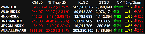 Chốt phiên giao dịch, VN-Index giảm gần 17 điểm, tương đương 1,72%, trong khi HNX-Index cũng mất gần 3% giá trị vốn hóa. Chỉ số VN30-Index - đại diện cho nhóm 30 cổ phiếu vốn hóa lớn, thậm chí còn nới rộng đà giảm lên 22,4 điểm, tương đương 2,3%.