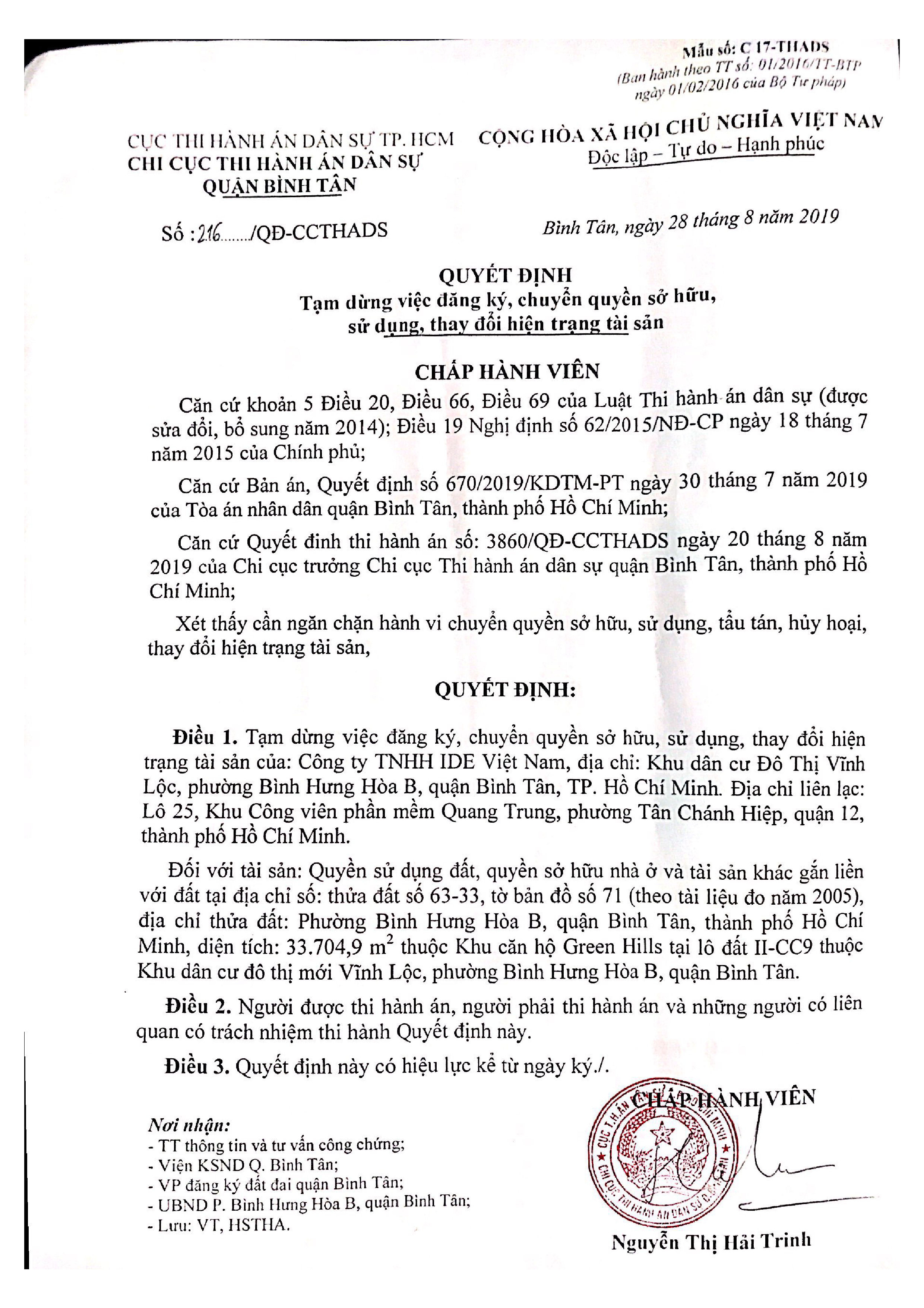 Cụ thể, Chi cục thi hành án dân sự quận Bình Tân đã ra quyết định số 215/QĐ–CCTHADS và 216/QĐ–CCTHADS về việc tạm dừng việc đăng ký, chuyển quyền sở hữu, sử dụng, thay đổi hiện trạng tài sản đối với hai tài sản thuộc sở hữu của Công ty IDE Việt Nam là trụ sở Công ty và dự án Green Town Bình Tân do IDE làm chủ đầu tư. Quyết định này có hiệu lực kể từ ngày 28/08/2019.