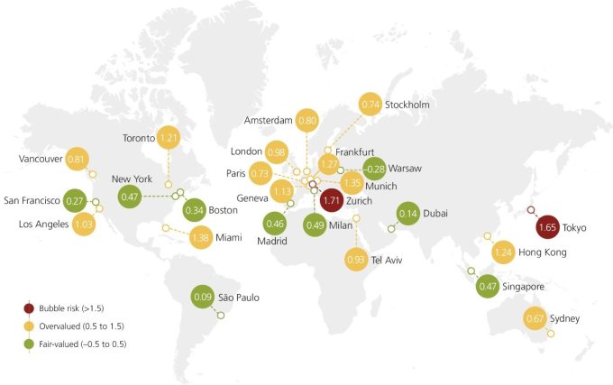 UBS định nghĩa "bong bóng" là việc định giá bị sai đáng kể và kéo dài của một bất động sản. Dấu hiệu điển hình được UBS xem xét để tính điểm xếp loại gồm sự chênh lệch tách biệt giữa giá nhà với giá thuê và thu nhập của cư dân địa phương, sự mất cân đối trong nền kinh tế theo hướng cho vay và xây dựng quá mức.