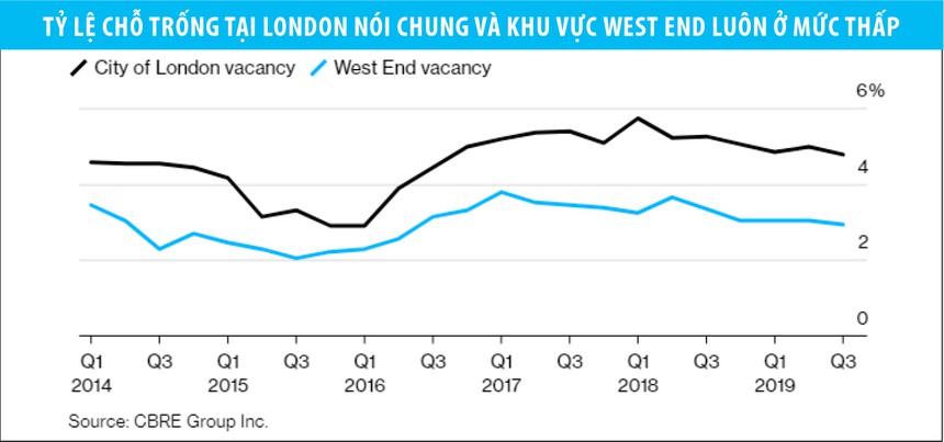 Sự kết hợp giữa nhu cầu cao, trong khi nguồn cung hạn chế dẫn tới tỷ lệ chỗ trống tại thị trường bất động sản ở mức rất khiêm tốn. Và khi nhu cầu vượt quá nguồn cung mới, tỷ lệ này sẽ ngày càng giảm xuống. Điều này dẫn tới giá cho thuê tại các khu vực sầm uất nhất của London liên tục tăng trong 2 năm qua.