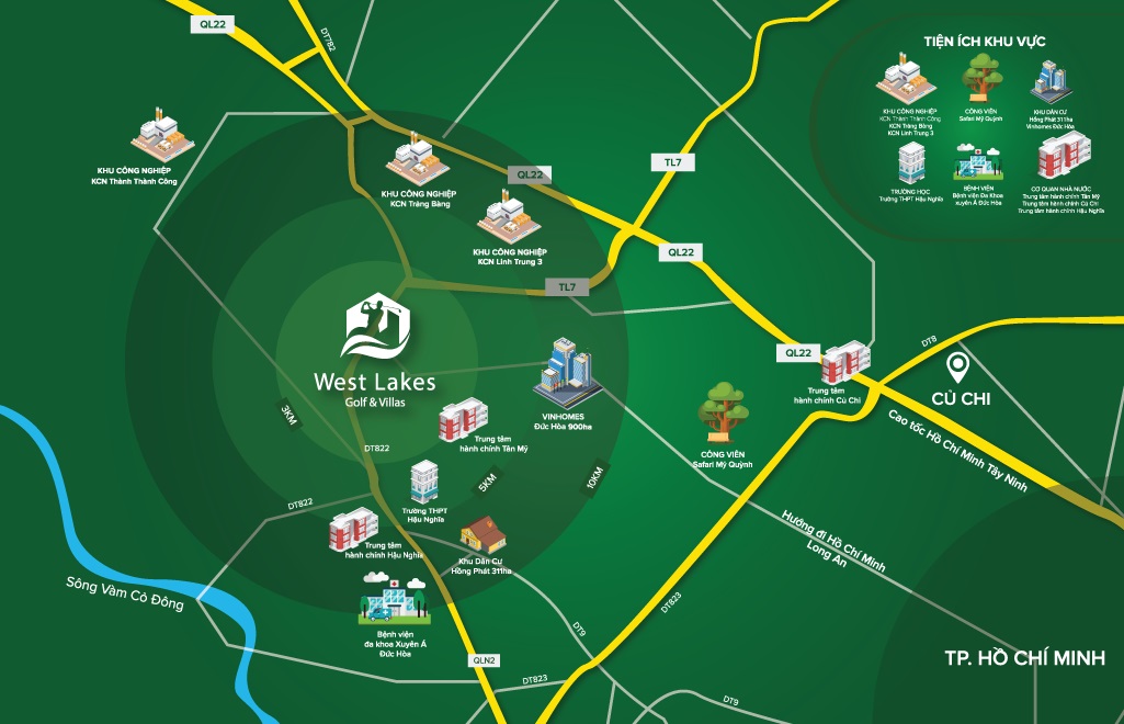 Một tin vui khi doanh nghiệp bất động sản Trần Anh Group sắp cho ra mắt dự án quy mô lớn ở Long An. Dự án với tên gọi West Lakes Golf & Villas tọa lạc vị trí mặt đường Tỉnh lộ 822, huyện Đức Hòa - địa bàn giáp ranh 3 huyện Hóc Môn, Củ Chi và Bình Chánh của TP. HCM. Giao thông kết nối TP. HCM thuận tiện với các tuyến Quốc lộ 1A, Quốc lộ 22, cao tốc TP. HCM – Trung Lương... Trở lại câu chuyện công thức 60:60, thì nơi West Lakes Golf & Villas tọa lạc chính là một địa điểm lý tưởng để phục vụ nhu cầu nghỉ dưỡng ven đô.