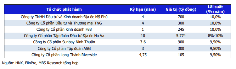 Theo thống kê của MBS, trong 6 tháng đầu năm 2022, các doanh nghiệp bất động sản chiếm phần lớn top những doanh nghiệp phát hành hành trái phiếu có lãi suất cao nhất kể từ đầu năm, có thể kể đến như: Công ty Cổ phần Đầu tư và Phát triển Bất động sản An Gia (11%); Công ty Cổ phần Đầu tư và Phát triển du lịch Phú Quốc (10%); Công ty Cổ phần Tập đoàn Địa ốc Nova (8%-10%); Công ty Cổ phần Sunbay Ninh Thuận (9,5%); Công ty Cổ phần Long Thành Riverside (9,5%); Công ty TNHH Đầu tư và Kinh doanh Địa ốc Phú Mỹ (10%).