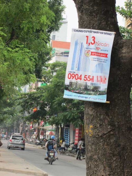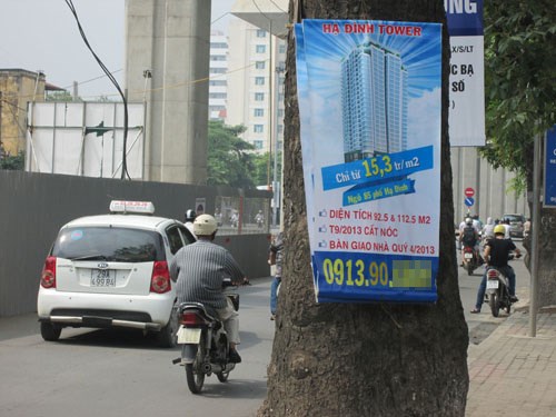 Nhiều dự án nhà ở, chung cư được quảng cáo ở thân cây trên nhiều tuyến phố (đường Nguyễn Trãi- Hà Đông)