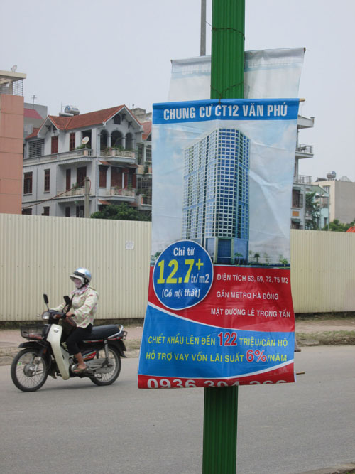 Một cột điện treo hai băng rôn quảng cáo chào bán chung cư (Khu Đô thị Mỗ Lao- Hà Đông).