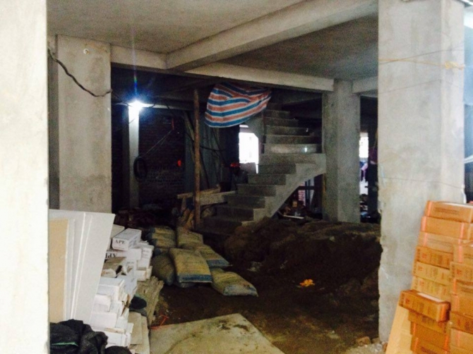 Phía tầng 1 vẫn còn ngổn ngang gạch, cát.