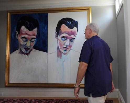 | Larry Dean, nay đã 67 tuổi, lặng ngắm bức chân dung tự họa của con trai ông trong phòng nghệ thuật hôm bán đấu giá thứ sáu. Ảnh: New York Times |