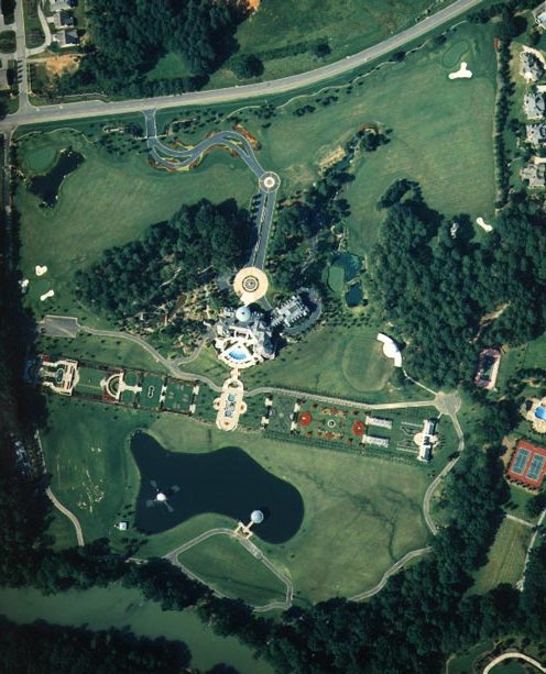 | Quang cảnh từ trên cao của bất động sản, với căn nhà, hồ nước và sân golf 18 lỗ. Ảnh: Luxist.com |