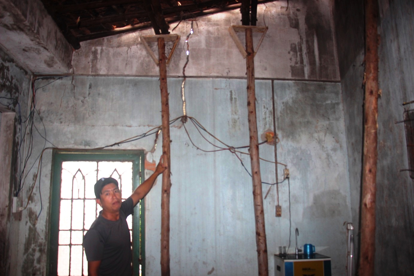Anh Phạm Văn Cường thấp thỏm dùng cây chống trong ngôi nhà chằng chịt vết nứt. Ảnh: Dũ Tuấn.