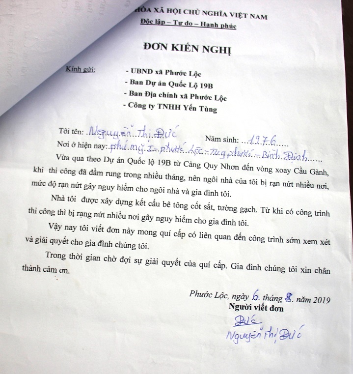 Người dân xã Phước Lộc gửi đơn đến chính quyền, phản ánh việc thi công quốc lộ 19 gây nứt nhà. Ảnh: Dũ Tuấn.