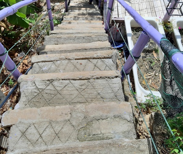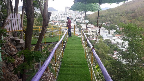 Phía bên trong khu vực này được xây dựng thành điểm không gian đẹp theo phong cách Đà Lạt, bàn ghế cho khách ngồi uống nước, khu cầu thang cho khách chụp hình. Tại khoảng không bên chân ngọn núi cheo leo, gia chủ lắp đặt hành lang cố định chỉ bằng các trụ inox để chụp hình nhìn rất nguy hiểm.