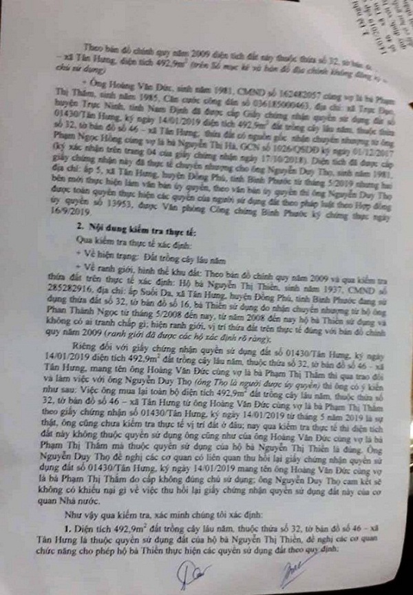 Phát hiện mảnh đất mình đang quản lý đã bị cấp giấy chứng nhận cho người khác. Ông Sanh gửi đơn khiếu nại đến UBND huyện Đồng Phú và Sở TN&MT tỉnh Bình Phước. Ngày 18/9, Chi nhánh VPĐKĐĐ huyện Đồng Phú mời ông Sanh cùng đại diện xã Tân Hưng đến vị trí đất để kiểm tra. Qua kiểm tra, xác định giấy chứng nhận số 01430/Tân Hưng ngày 14/1/2019, cấp cho vợ chồng anh Đức với diện tích 492,9m2, đã chồng lên đất ông Sanh.