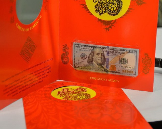 Một sản phẩm khác trong bộ sưu tập năm nay là "Vòng may mắn Rồng Phượng" với 1 tờ 100 USD đặt bên trong một tệp bìa đỏ trang trí hoa văn rồng phượng, hai linh vật thiêng của văn hóa phương Đông.