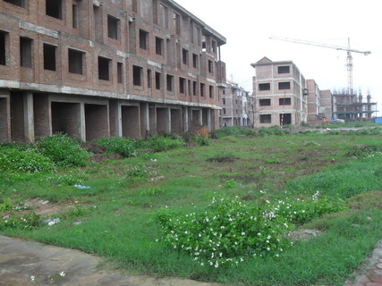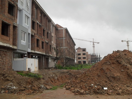 Hàng loạt khu nhà liền kề sắp hoàn thiện nhưng người dân không thể dọn về ở vì chủ đầu tư không hoàn thành cơ sở hạ tầng như cam kết. Trước cửa khu nhà là một trạm biến áp sắp mọc lên mà không nằm trong quy hoạch.
