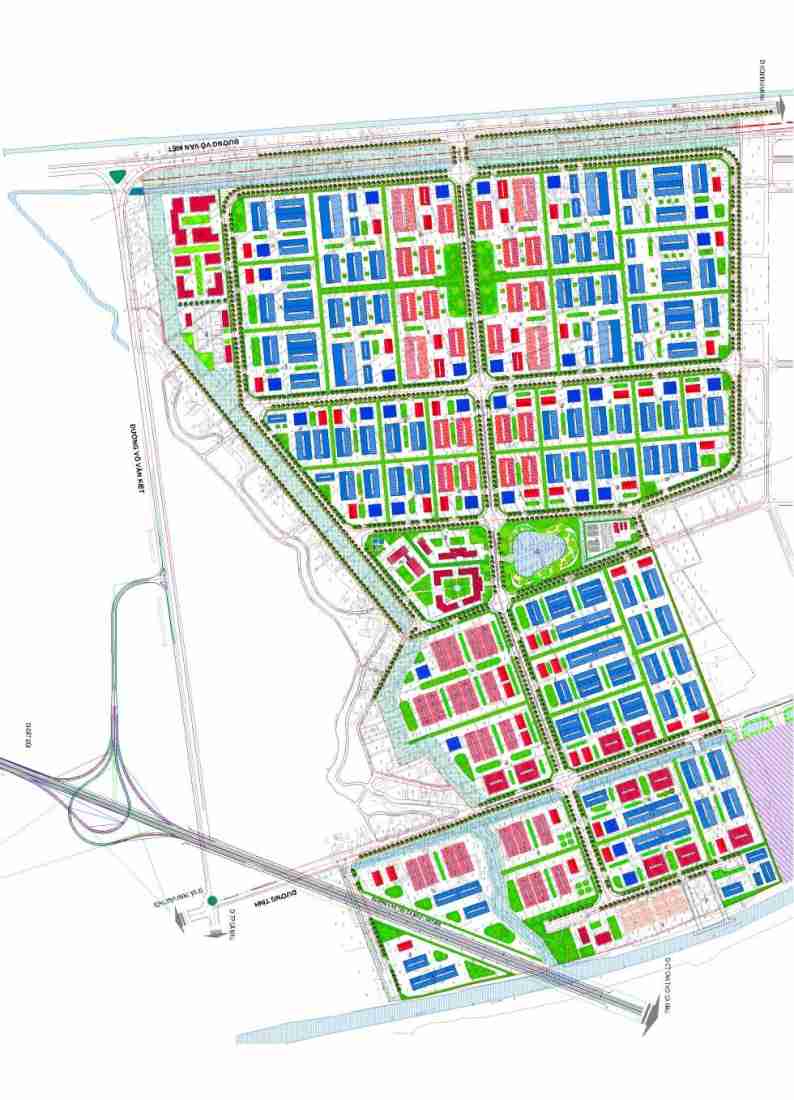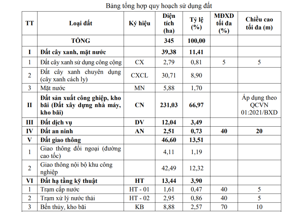 Hệ thống sử dụng đất gồm các nhóm: đất sản xuất công nghiệp 231,03ha (66,97%); đất giao thông hơn 46,6ha; đất cây xanh - mặt nước hơn 39,38ha; đất dịch vụ 12,04ha; đất hạ tầng kỹ thuật 13,44ha; đất an ninh 2,51ha.