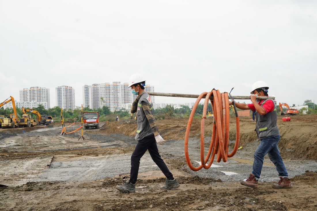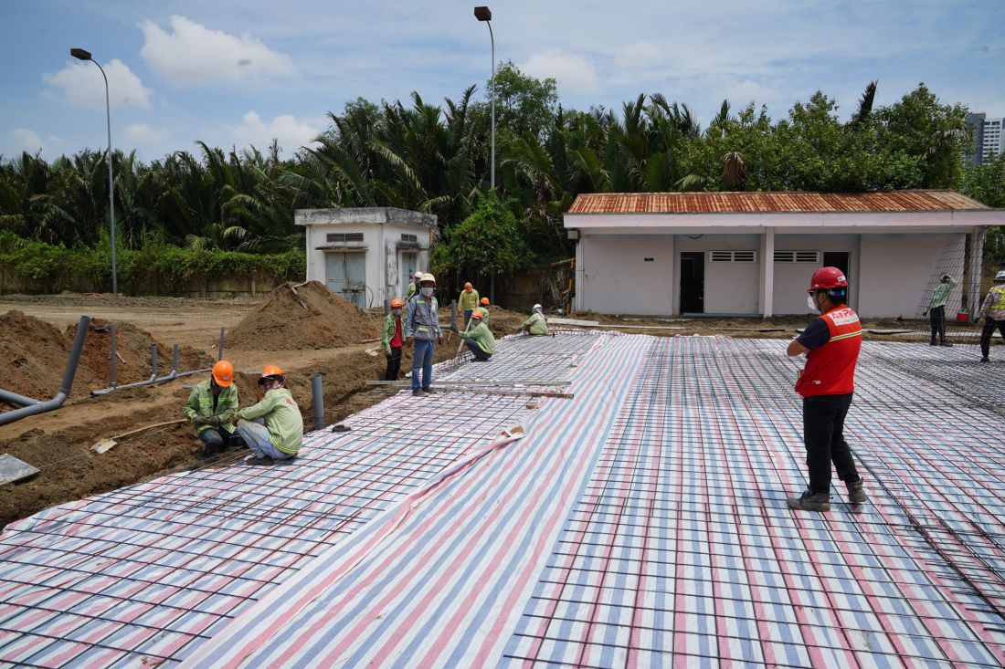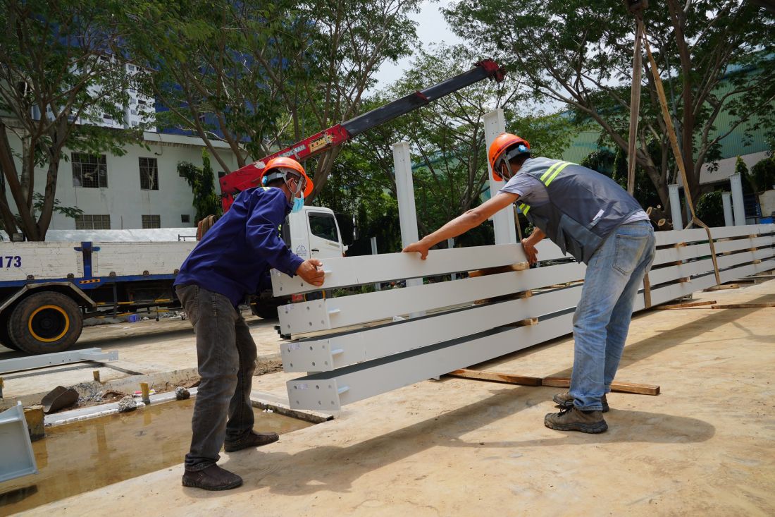 Tùy vào giai đoạn công việc, số lượng công nhân được điều phối nhiều hay ít. Công trình sau khi lan lấp sẽ làm móng, đổ bê tông nền, bắt điện, nước, lắp ráp nhà tiền chế…
