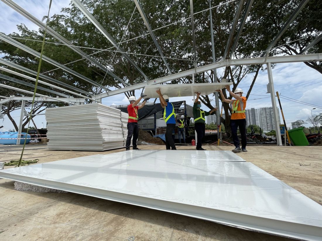 Một khu vực tại Bệnh viện dã chiến Q.7 sắp thành hình, có thể 10 ngày nữa được đưa vào sử dụng. ẢNH: DUY TÍNH