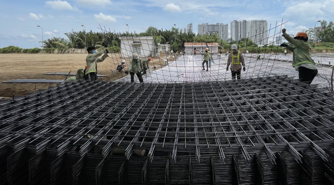 Công nhân chuẩn bị vỉ sắt đổ bê tông nền tại Bệnh viện dã chiến ở Q.7. ẢNH: DUY TÍNH