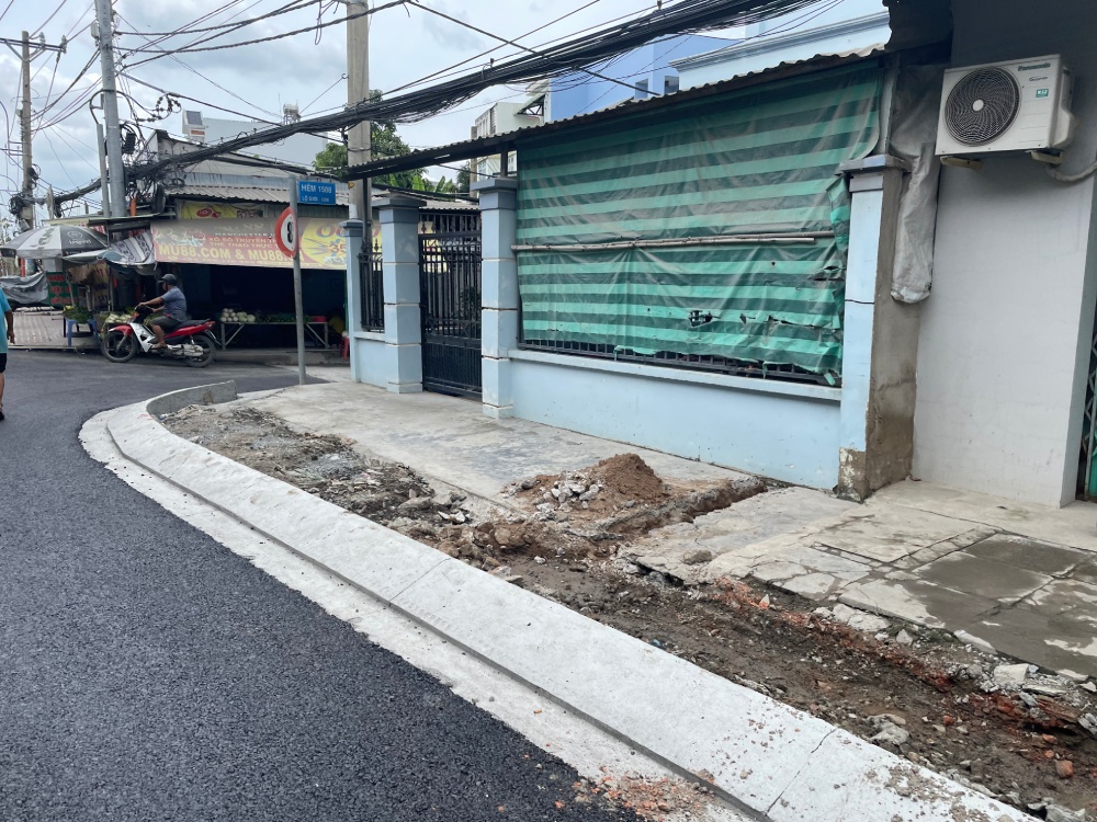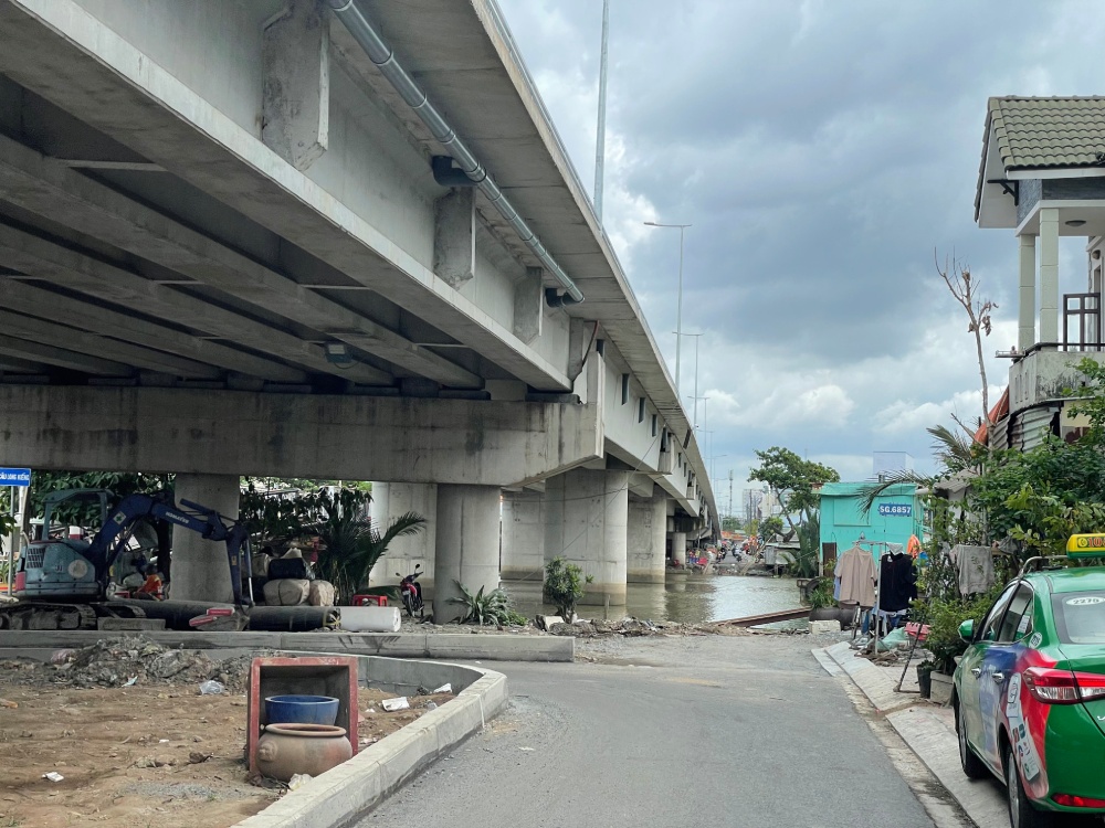 Phần lề đường phục vụ nhà dân 2 bên đường dẫn vẫn tiếp tục được thi công.