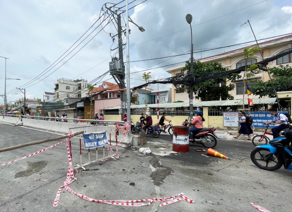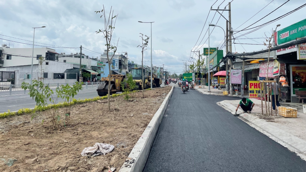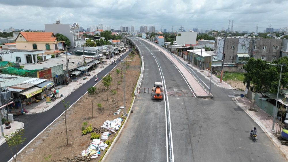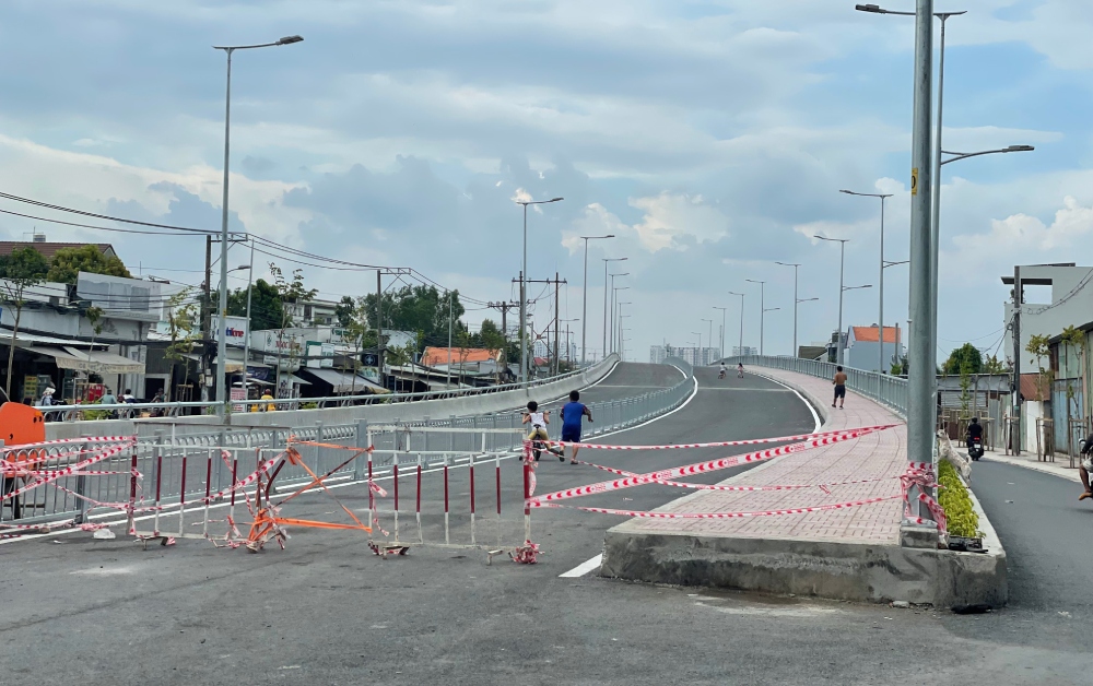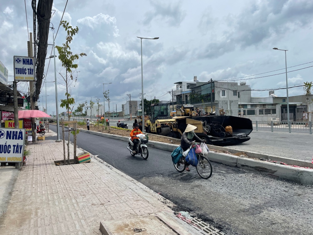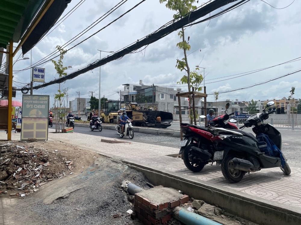 Hiện phần đường 2 bên cầu đang được trải nhựa đường, một số đoạn chưa hoàn thiện gây bất tiện cho người lưu thông.