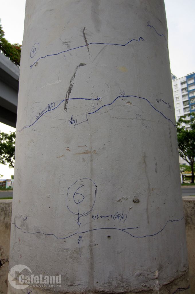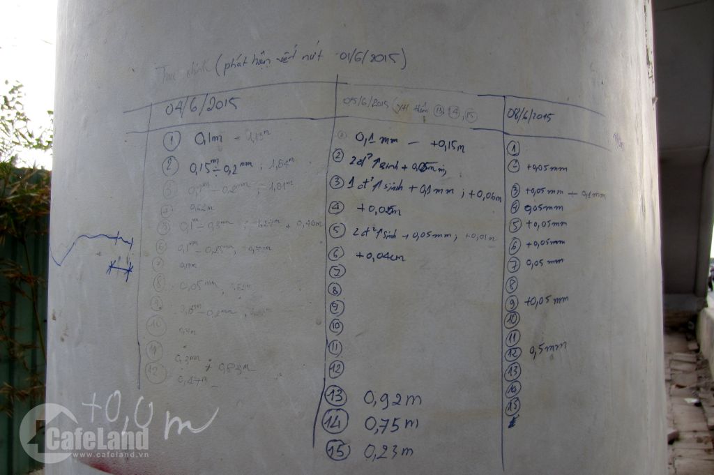 Ngành chức năng đánh dấu các số liệu sụt lún trên trụ cầu đường bộ số 3.