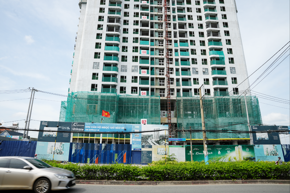 Trong ảnh là dự án The Emerald 68 (Khu căn hộ Ngọc Lục Bảo 68), tọa lạc mặt tiền Quốc lộ 13, TP Thuận An, Bình Dương (nay là phường Lái Thiêu, TP.HCM) do Tập đoàn Lê Phong và Coteccons làm chủ đầu tư. Dự án này được mở bán đợt đầu vào cuối năm 2024 với mức giá 55 triệu đồng/m2. Trên các trang rao vặt, giá bán căn hộ tại dự án này lên tới 65 triệu đồng/m2 - mức giá được đánh giá là khó tiếp cận đối với phần lớn người mua nhà lần đầu, kể cả nhóm có thu nhập khá.
