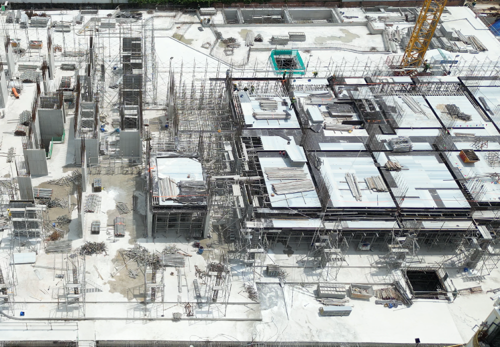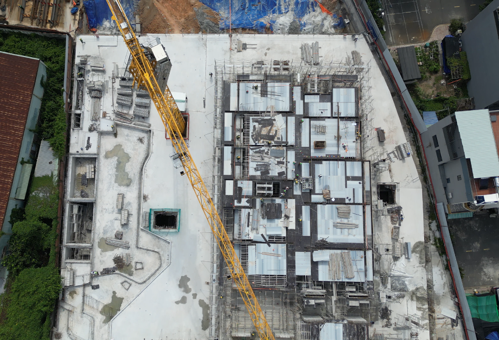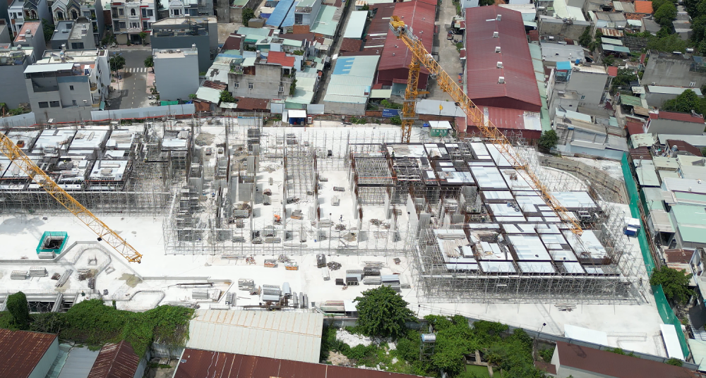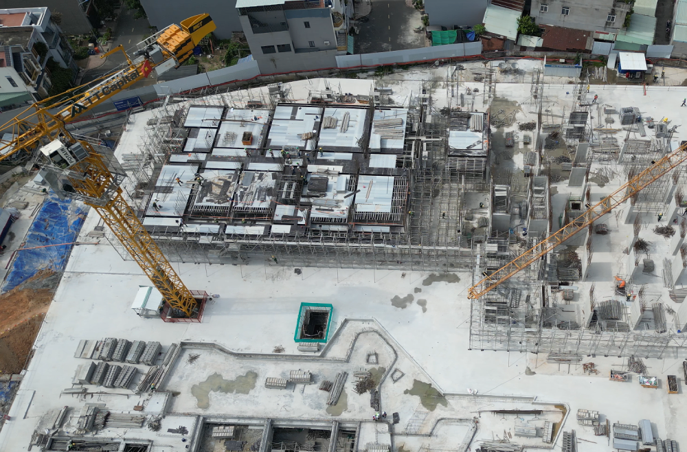Hiện nay, nhà thầu Ricons đang triển khai dựng cốp pha, cốt thép và đổ bê tông sàn các tầng 2-3. Các khu vực tập kết vật liệu xây dựng được bố trí riêng biệt.