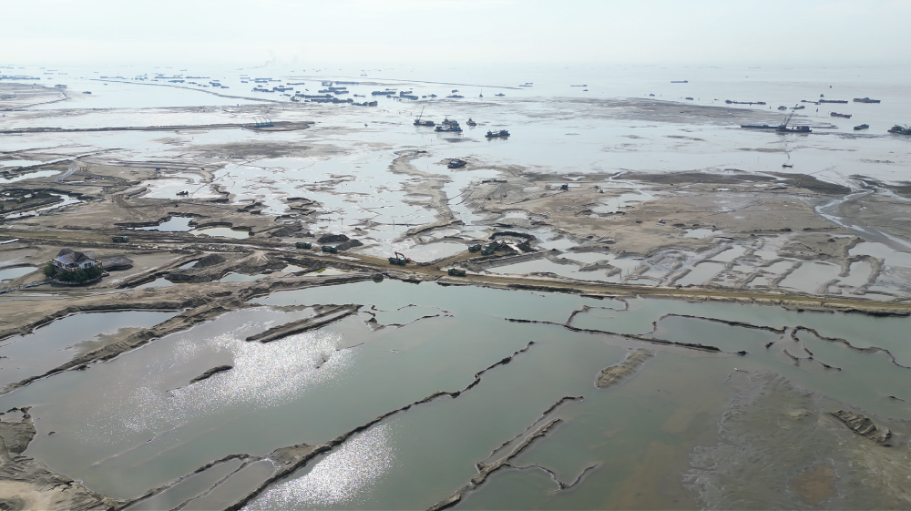 Tại khu vực giáp ranh giữa đất liền và vùng lấn biển, hệ thống đê bao, đường công vụ, bãi tập kết vật liệu cùng khu nhà điều hành thi công đã dần hiện hữu. Ngoài khơi, hàng chục tàu hút bùn, sà lan và cần cẩu chuyên dụng hoạt động liên tục, bơm cát tạo nền trên diện tích hàng trăm ha.