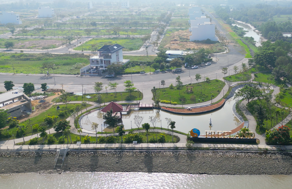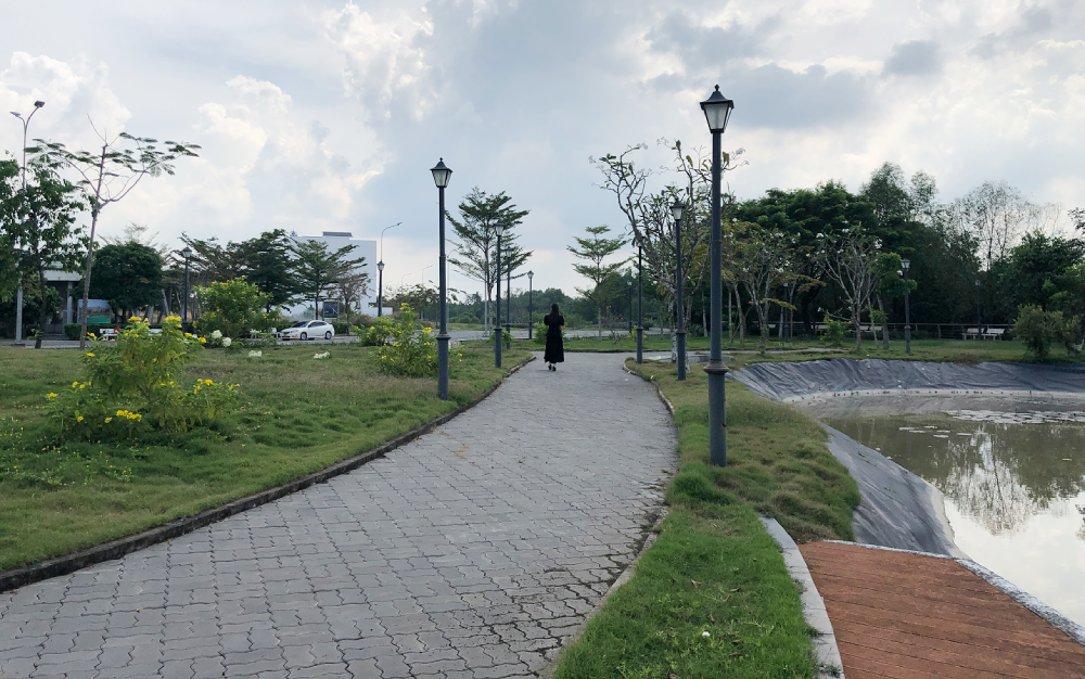 Chủ đầu tư cũng đã hoàn thiện công viên ven sông, có hồ nước, lối dạo bộ, thảm cỏ và bảng hiệu “FreeLand” nổi bật.