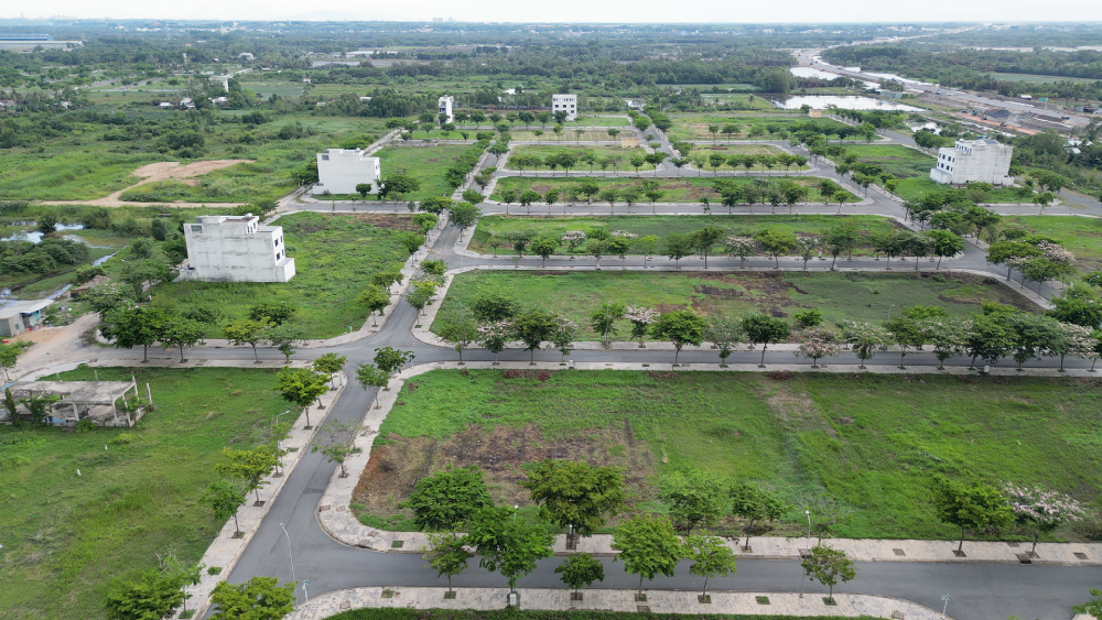Phần lớn diện tích của dự án King Bay hiện vẫn là những khu đất trống rộng lớn, được san lấp bằng phẳng nhưng chưa có công trình xây dựng đáng kể. Từ trên cao, có thể thấy những ô đất được phân lô rõ ràng, bao quanh bởi hệ thống đường nội khu đã hoàn thiện, song phần nhiều vẫn phủ một màu xanh của cỏ dại và cây bụi mọc tự nhiên.